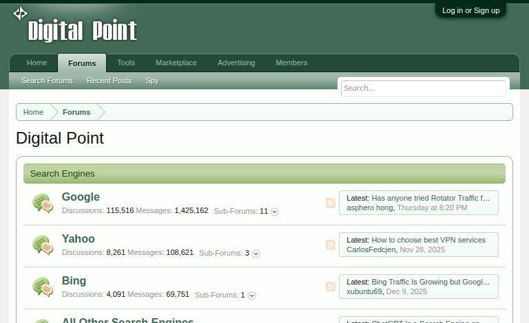 Start with the Search Engines part. You will find forums for Google, Yahoo, and Bing. These are the big three search engines. You may think of Yandex or DuckDuckGo, but Digital Point mostly cares about the U.S. crowd.